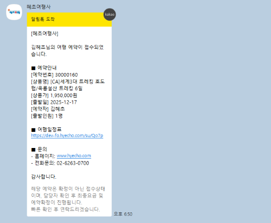 여행 예약 및 변경 사항, 여행계약서, 출발 관련 정보 등을 카카오 알림톡 등으로 실시간 안내해드립니다.