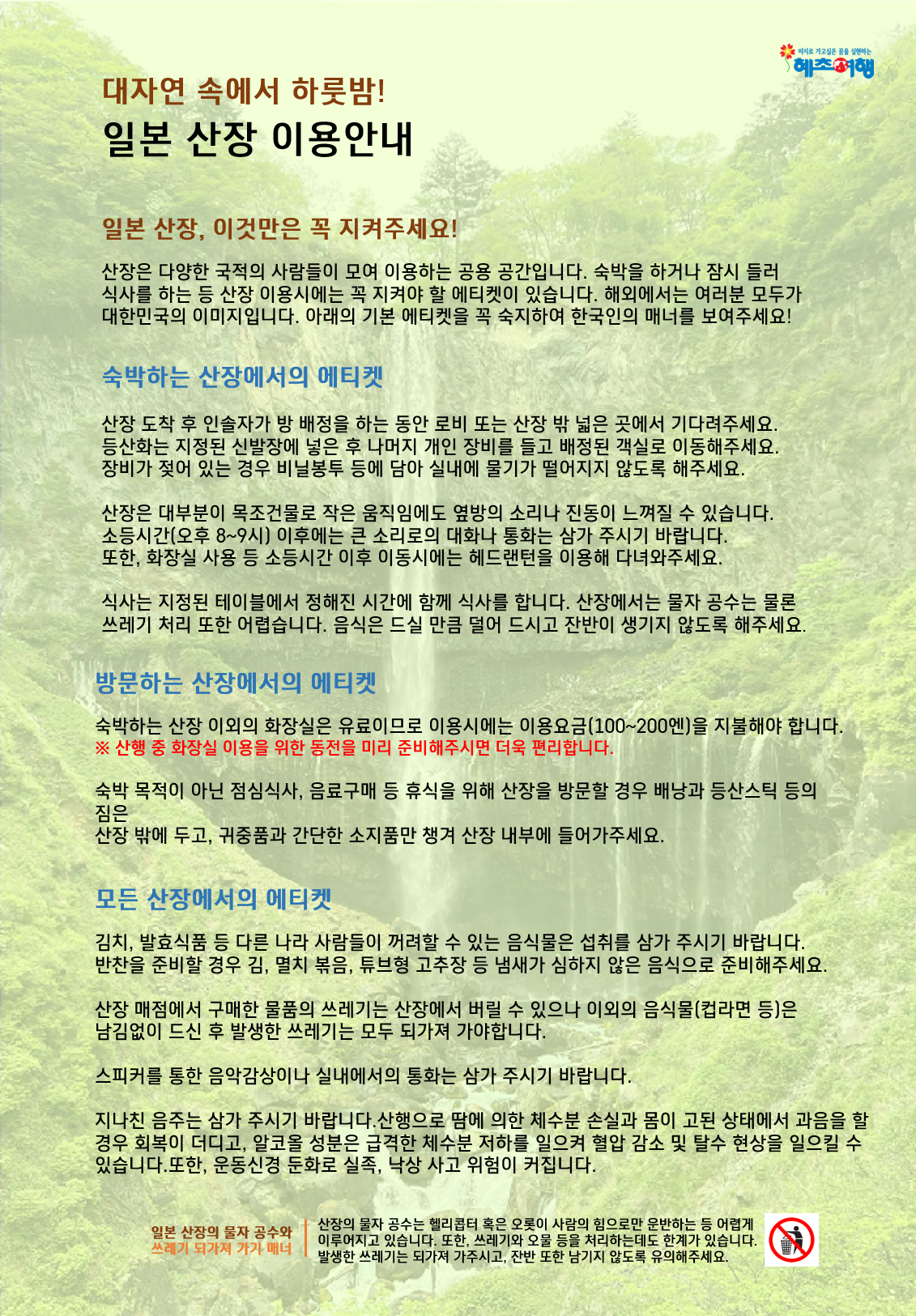 - 식후 직후, 음주 후, 추운 곳에서 노출된 직후의 온천 이용은 신체에 큰 무리를 줍니다.