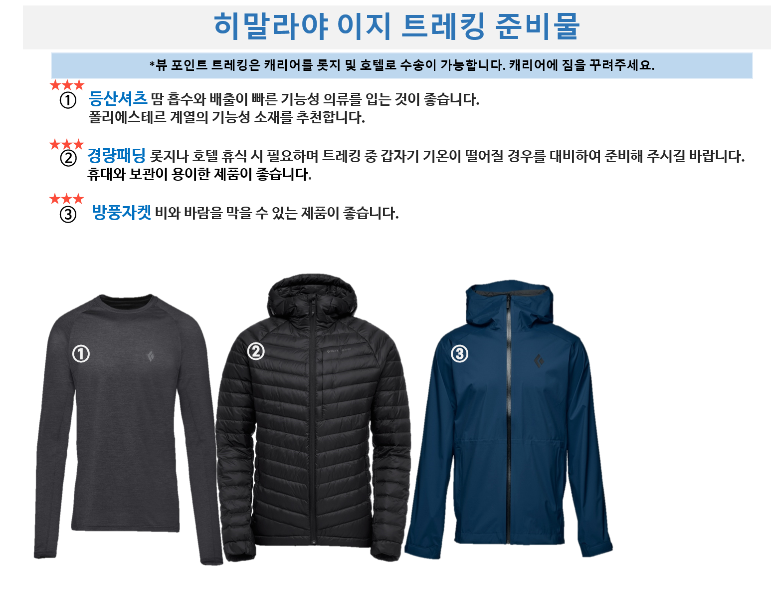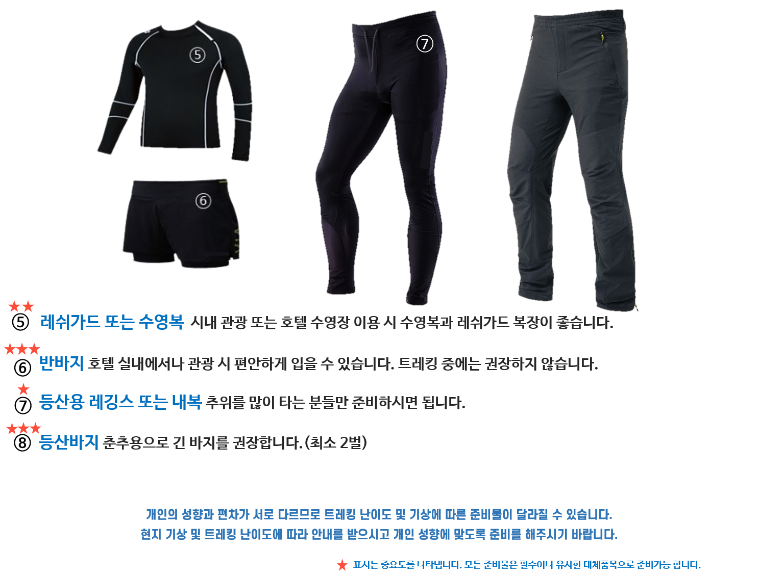 침낭 및 공통적으로 대여하거나 지급되는 장비를 제외한 개인의 트레킹에 필요한 장비는 개인이 직접 준비하여 사용해주시기 바랍니다. 미흡한 장비로 인해 발생하는 책임은 본인에게 있습니다.