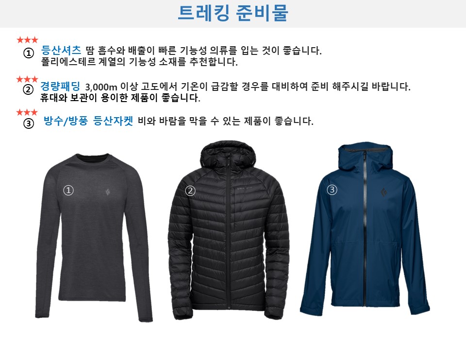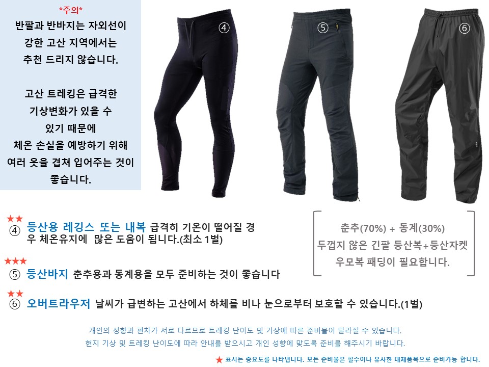 트레킹 시 첫날은 여름/가을 복장, 정상 등정시는 겨울복장입니다.