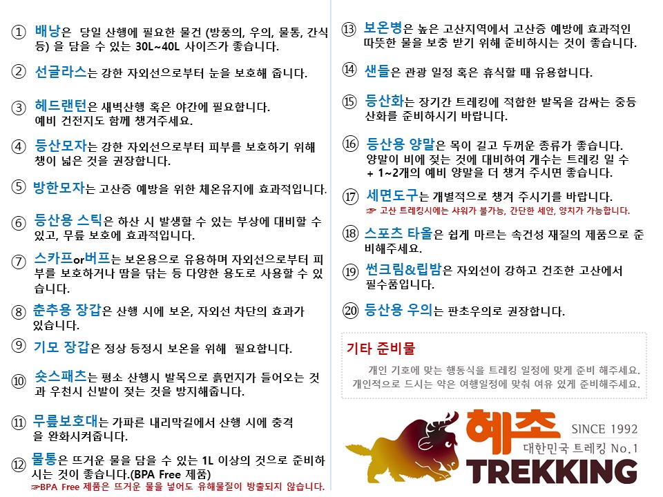 나누어 준비하시는 것이 편리합니다. 첫째 날 숙소에서 짐을 산행에 필요한 것과