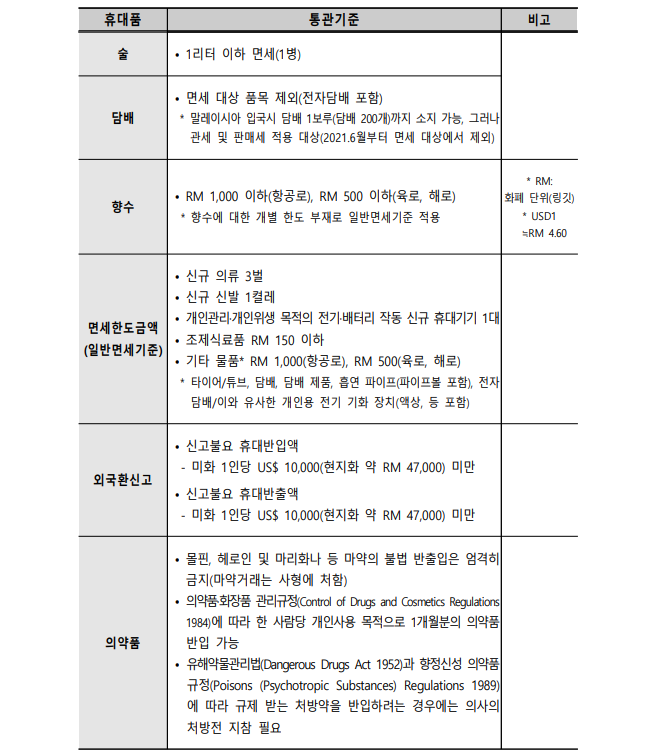 [말레이시아 여행자 통관정보 - 통관청] 2025.5 기준