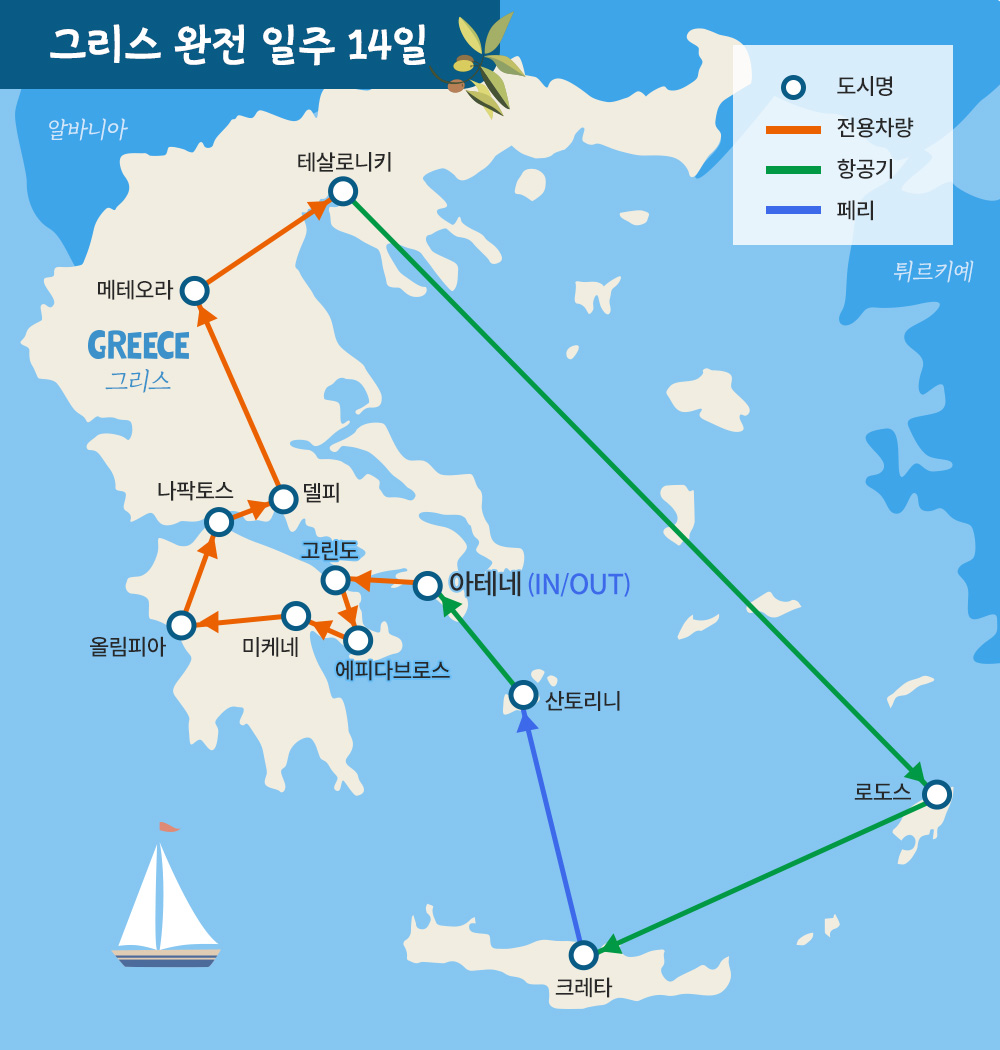 인천-아부다비-아테네-고린도-미케네-에피다브로스-올림피아-델포이-칼람바카(메테오라)-베르기나-테살로니키-로도스-크레타-산토리니-아테네-아부다비-인천