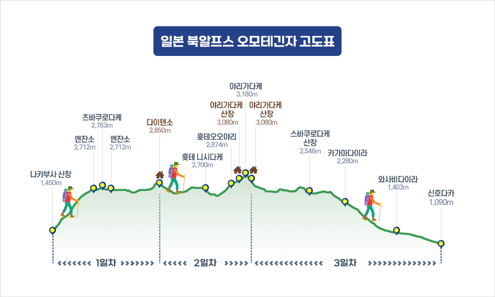 일본에서 가장 유명한 북알프스의 아름다운 능선길 '오모테긴자'와 함께 일본에서 가장 아름다운 봉우리라 불리는 '야리가다케'를 한번에 만날 수 있는 여정. 강력하게 추천드려요!